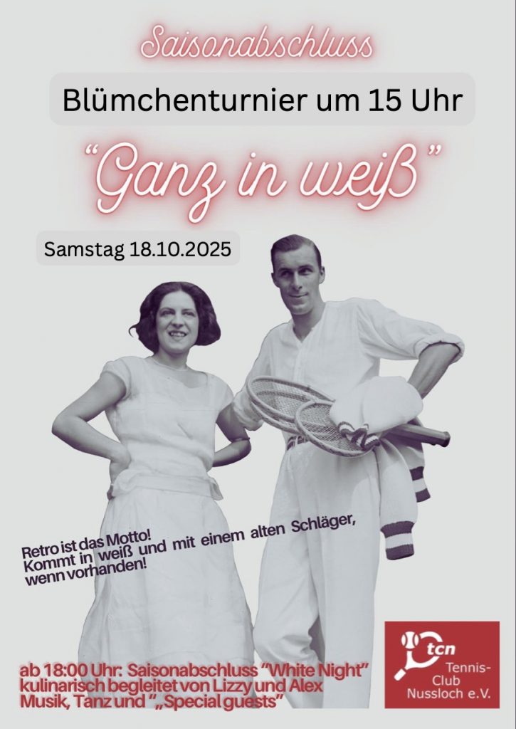 Am Samstag, dem 18.10.25 starten wir um 15 Uhr mit unserem „Ganz in weiß“-Saisonabschluss-Turnier wie gewohnt mit wechselnden Mixed-Doppeln. Die Glücksfee entscheidet über die Partnerzusammenstellung! Wir würden uns freuen, wenn möglichst viele noch einmal auf unsere Anlage kommen würden – am besten ganz in weiß! Im Anschluss gegen 18 Uhr wollen wir gemeinsam bei unseren Clubwirten Lizzy und Alex zu Abend essen – auch hier wer hätte das gedacht – ganz in weiß! Live-Musik gibt es dann wieder im Anschluss. Wir freuen uns auf euer zahlreiches Erscheinen!